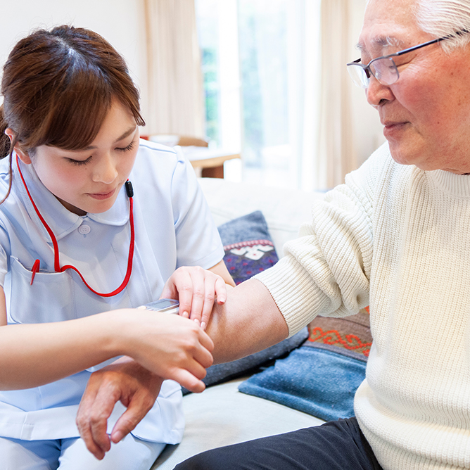 ご利用者様の自宅に訪問し、医師の指示に基づいて病状観察、創傷